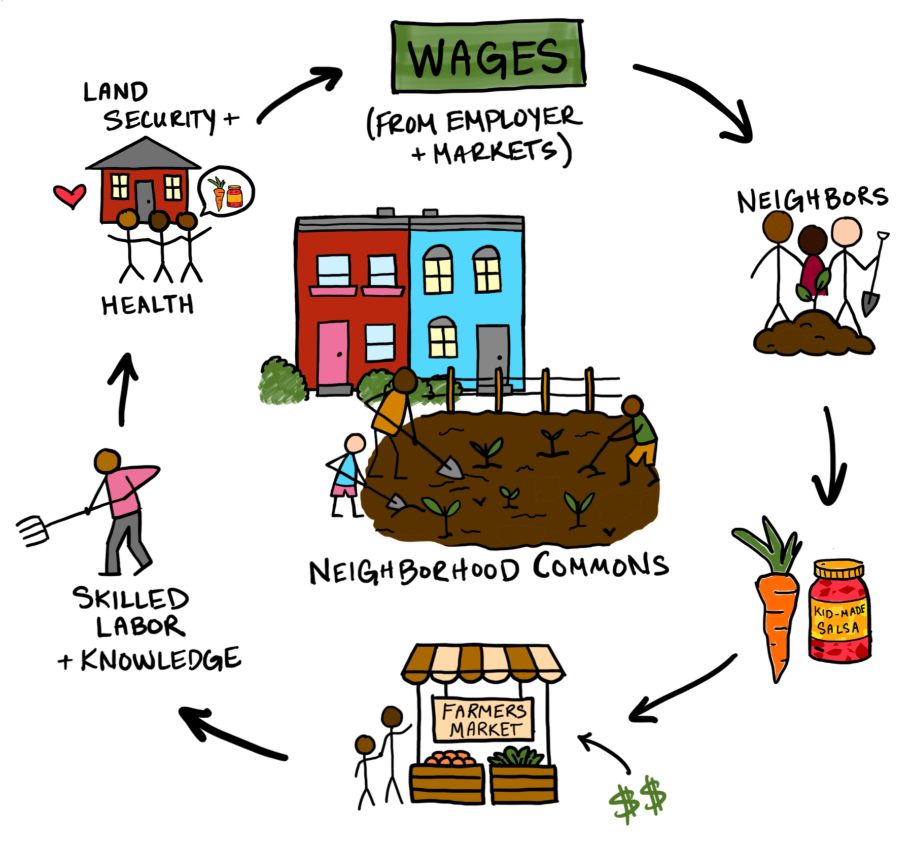 Rootwork Commons is structured as a neighborhood-scale economy rooted in land stewardship, paid labor, and local circulation.