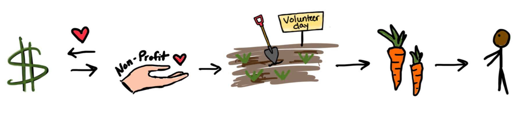 This page offers a visual explanation of how value moves through the project, and how this differs from more typical charity-based approaches.